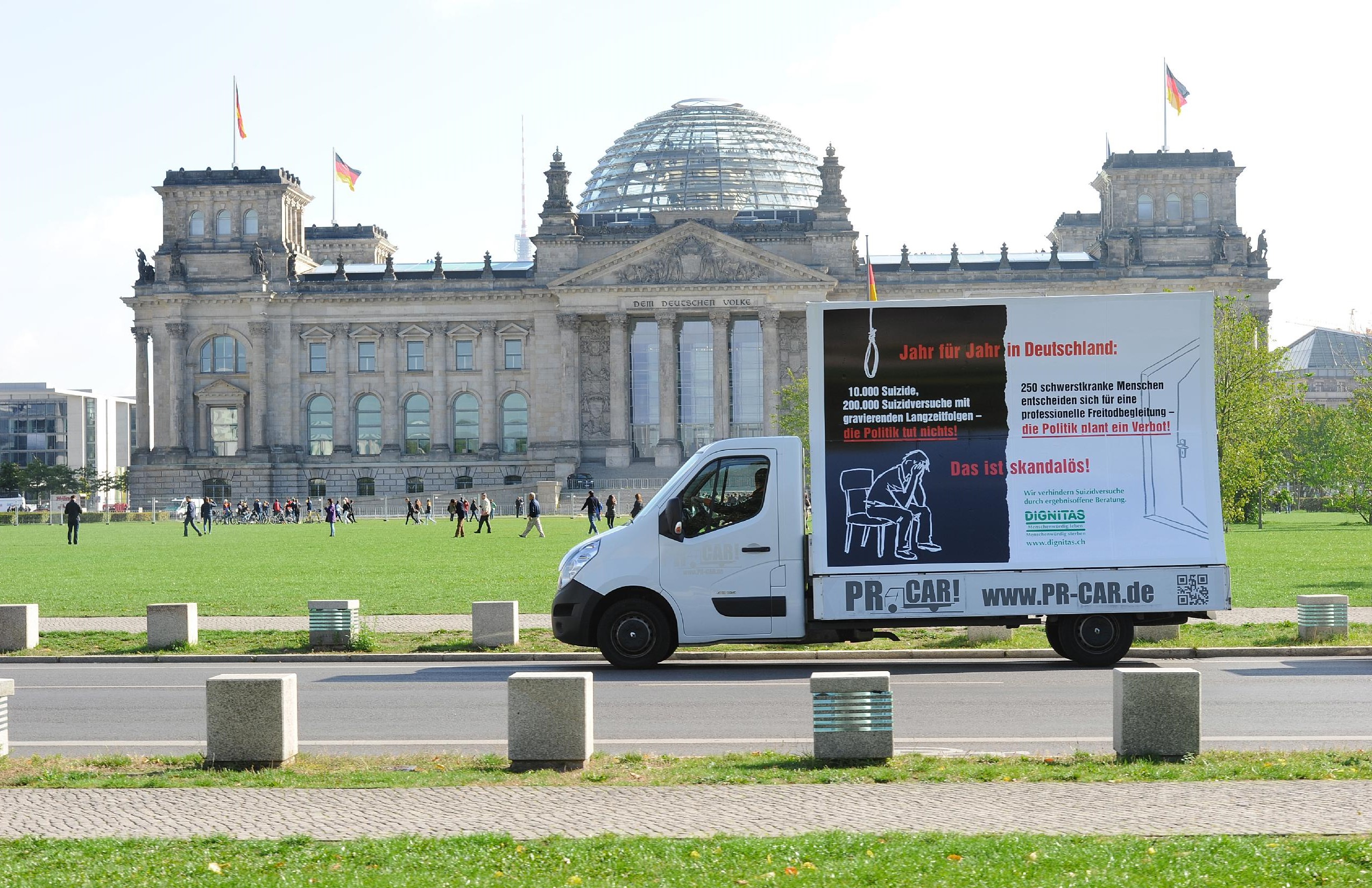 Plakat Dignitas-Kampagne in der U-Bahn Berlin Film Dignitas-Kampagne im Berliner Fenster der U-Bahn Berlin Dignitas-Car mit Plakat vor dem Reichstagsgebäude in Berlin